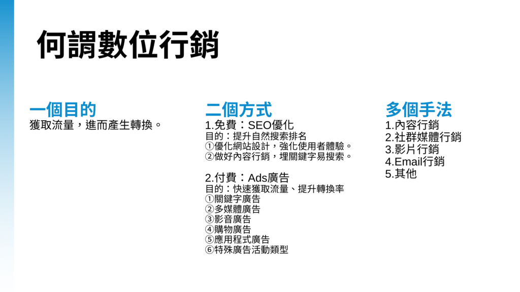 在解釋此問題之前,必須先了解數位行銷的概念,不論是使用免費的內容行銷,亦或是付費的廣告,最終的目的都是獲取流量,進而產生轉換,但如果一個網頁的內容過於空泛,使用者點擊進來找不到想要的東西,或是網頁卡頓太久,或甚至直接出現404的網頁(備註:404也是要掛GA追蹤碼,才知道多少人抵達404網頁哦),大大影響使用者體驗(UX),則會降低Google自然搜尋的排序(Organic),所以我們必須做好網站分析,才可以知道該優化的網頁在哪?流量最高的管道在哪?轉換貢獻最多的來源是誰?