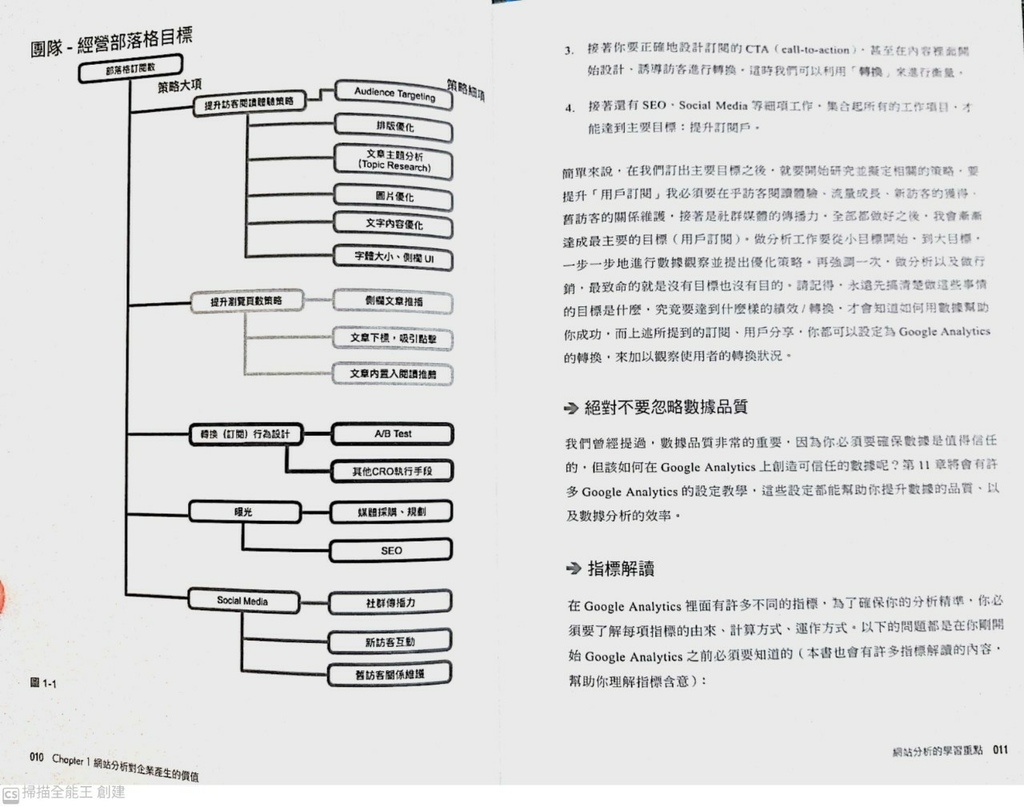 Harris先生有提到,能夠解讀GA報表不代表能夠做好網站分析,做好網站分析也不一定能夠正確的執行與優化,在他的著作《剖析Google Analytics:從報表理解到實作增訂版》一書中提到,網站分析大概流程分為①資料收集→②資料解讀→③做出決策→④執行決策,尤其千萬不要小看①資料收集這個步驟,因為你必須事先理解自己需要什麼數據,而且也必須確保數據品質,例如沒有將企業內部流量排除[#篩選器],那麼員工所點擊和瀏覽的數據,就會影響日後所看到的數據,大家也要理解,在GA報表的數據,大多都是不可逆的唷!放上書中網站分析的部落格範例給大家看(書籍的推薦,將會放到第3節敘述)。