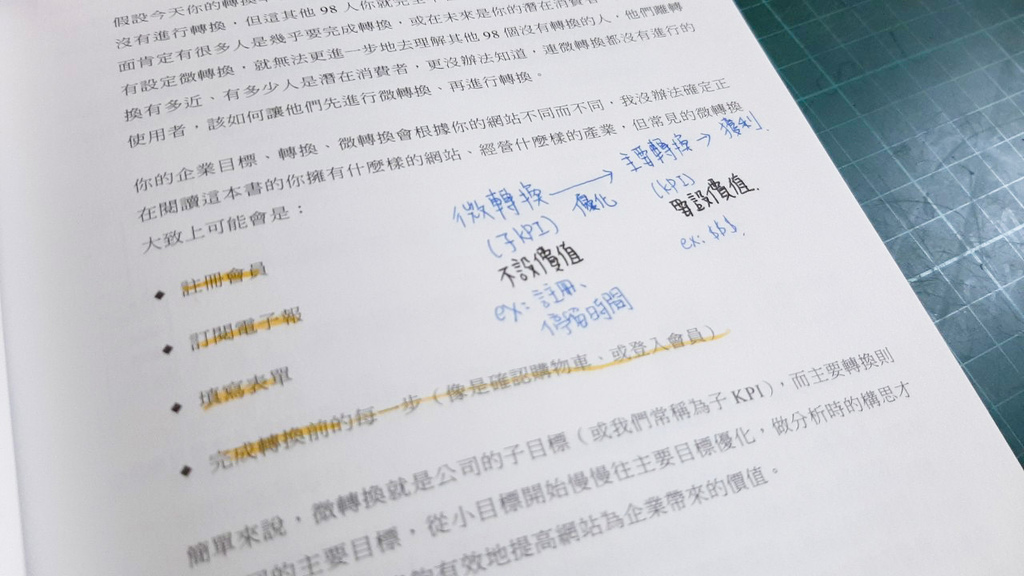 書中有提到,微轉換(子目標)的概念,在Google Ads認證的「學習如何評估 Google Ads 廣告活動成效」也有提到,微轉換像是停留時間、工作階段數等,可以做為主要轉換(收益)的前置評估,有可能有一批訪客在網站停留了很久,看了好幾個商品,但始終沒有按下購買,所以產生高的微轉換(高停留時間),但主要轉換很低,這時候就可以對這批訪客進行再行銷。常見的微轉換大致上可能為:註冊會員、訂閱電子報、填寫表單…等,因不同類型的網站而異。