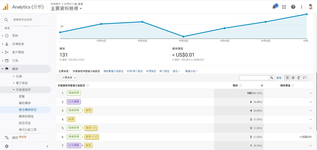 (5)消費者流程轉換分析:可透過GA了解消費者的瀏覽過程,使用歸因模式找出貢獻最高的管道來提升轉換。