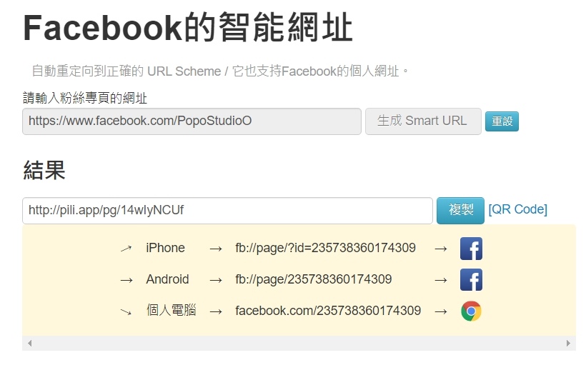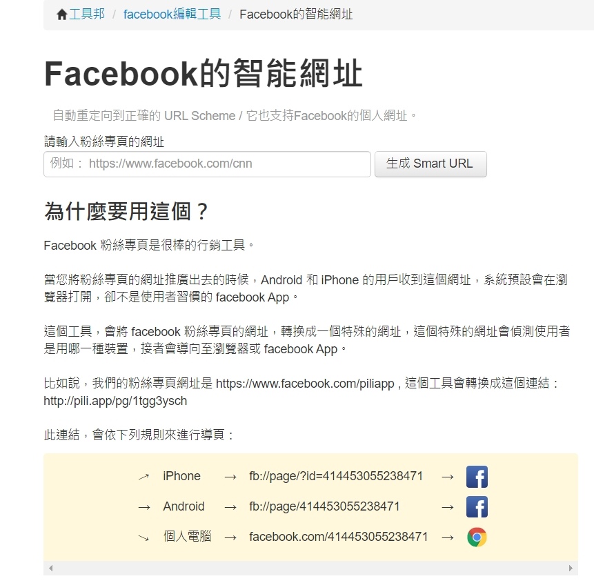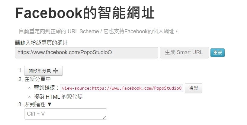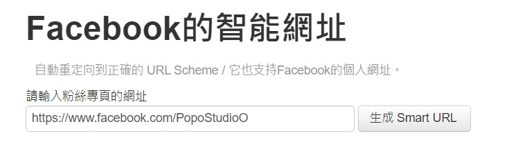 - 第一步:複製您的粉專網址,貼上後生成Smart URL