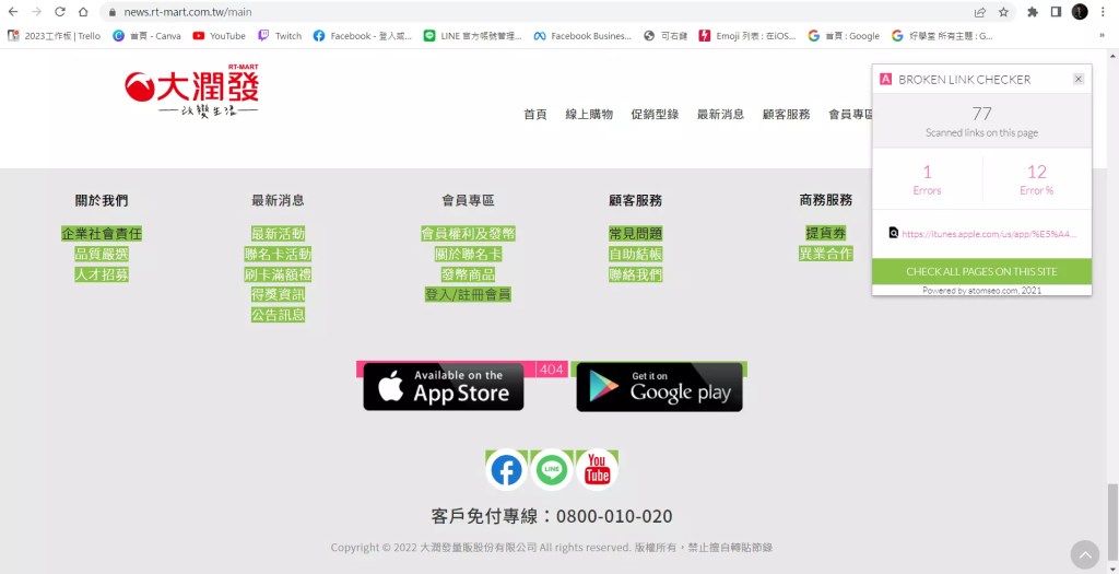 下方以大潤發的主頁為例,使用Broken link checker會顯示出失效連結的連結,其中iOS下載的圖片所設定連結被偵測為失效,點擊後會發現該網頁一直在轉圈圈,所以可藉由此工具來改善連結失效的問題。