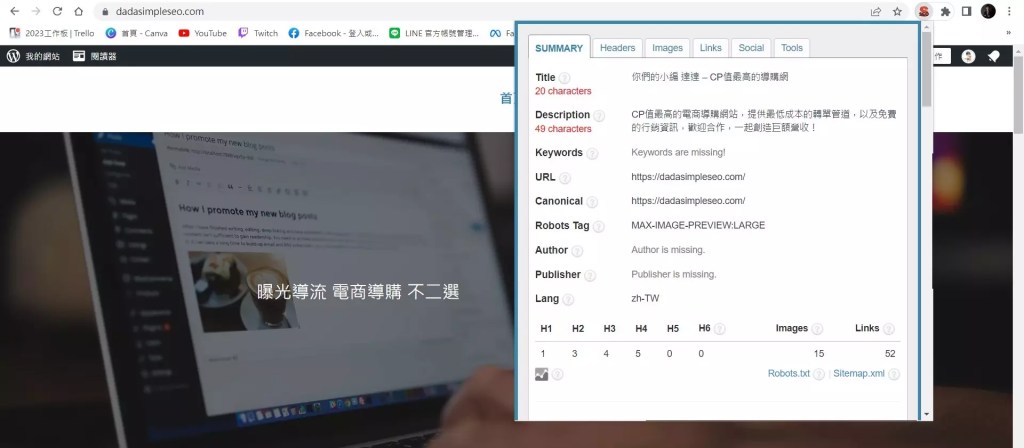 最後,我們使用SEO meta in 1 click來做網頁內的SEO優化,該工具可以快速檢查網頁的標題、描述,以及是否設有標準網頁,同時網站的H標籤是否設定正確、圖片是否有設定替代文字等,而這些細項該怎麼優化,以及為什麼要優化,未來再撰寫其他文章分享。