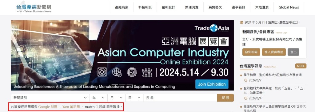 台灣產經新聞網成立於 2001 年,其訊息面向更為多元,包含產經商業、科技新訊、創新設計、樂活消費、展覽藝文、產學新訊、大陸港澳、Global Business News新聞等,一樣是透過註冊的方式,就可以在該網站的後台進行編輯發佈,值得一提的是,該網站有串Yam 蕃新聞、Google新聞及match 生活網三個新聞網同步聯播,等於只要上稿到台灣產經聯播網,就會同步上稿到Yam 蕃新聞、Google新聞及match 生活網,流量是很驚人的,非常推薦給各位!(補充:match生活網已於2024年7月31日終止服務,故目前只有串蕃薯藤及Google新聞。)