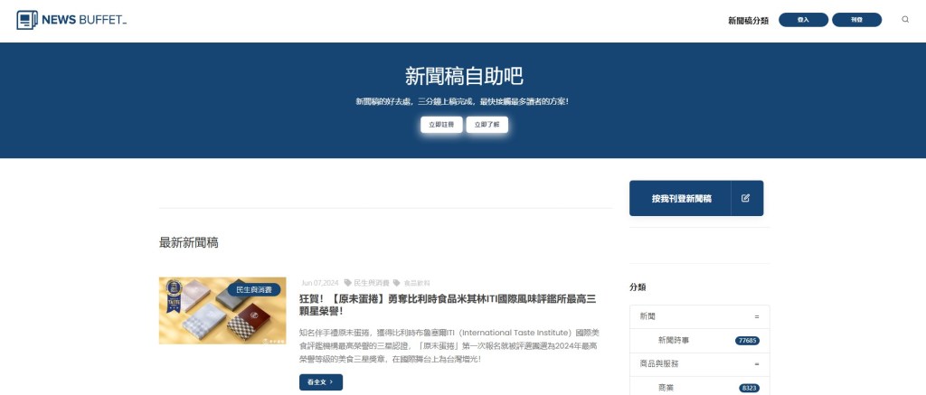 台灣新聞聯播網是達達最早接觸的免費新聞稿平台,該平台的主題分為產業快訊、育樂活動、樂活消費、政府佳績與在地新聞,只需要透過註冊,即可在該網站發文投稿,待管理員審核後,會於1-2日的工作天上稿,我也曾有過發稿當天即上稿,速度算是蠻快,且上稿的內容只要符合規範、不要太誇張,基本上很容易上稿。而台灣新聞聯播網的網站權重為41分,流量平均每月有2,300,在眾多免費新聞稿網站中,算是很不錯的選擇!