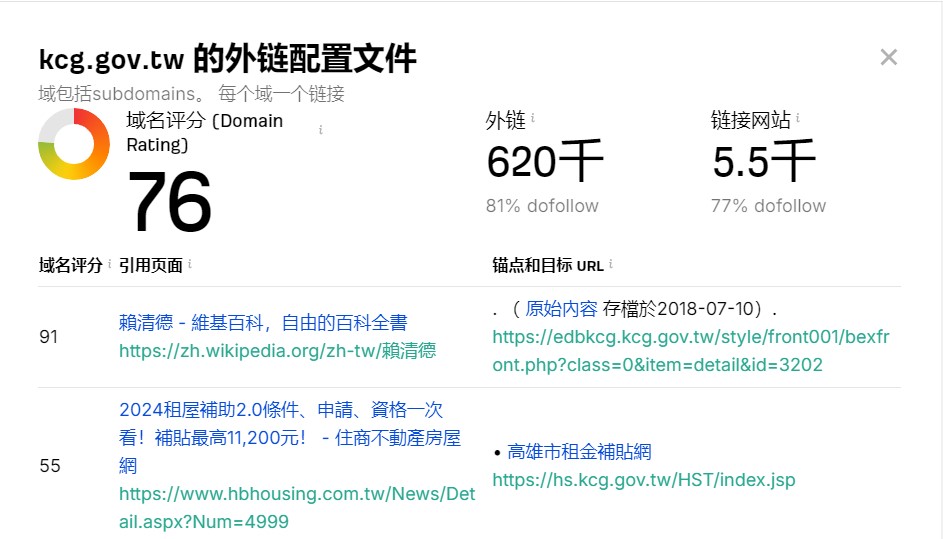 首先使用「外連檢查」的免費功能,這個功能就已包含網站權威的檢查,例如我將高雄市政府的網址貼上,可以看到其網站的權重高達76分,包含28,000個外部連結,畢竟是公家單位,可信度是很高的,如果可以被此網站反向連結到自有官網,那麼自有官網權重就有機會被加分。如果是一般企業的官網,權重可以達到20分以上就算是很不錯了!大家可以把20分當作一個目標~
