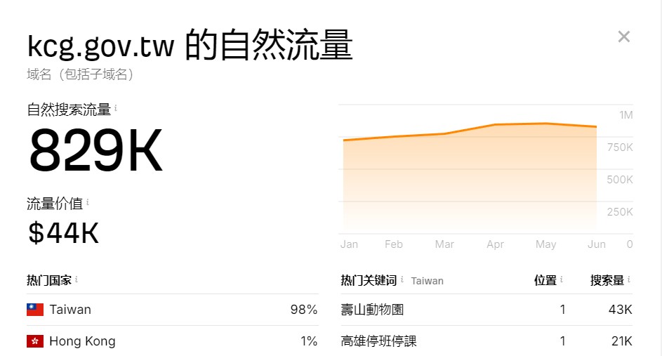 接著使用流量檢查的功能,可以檢視該網站自然搜尋的平均月流量,該流量並不是一個精準值,和自己在GA4看到的數據一定會有落差,根據業內人士表示,該網站監測之流量應為低估,且可能低估不少,畢竟是站外分析的工具,實際值應該會更高一些,但是可以當作參考依據,例如高雄市政府的網站每月有約829,000的流量,是非常高的。