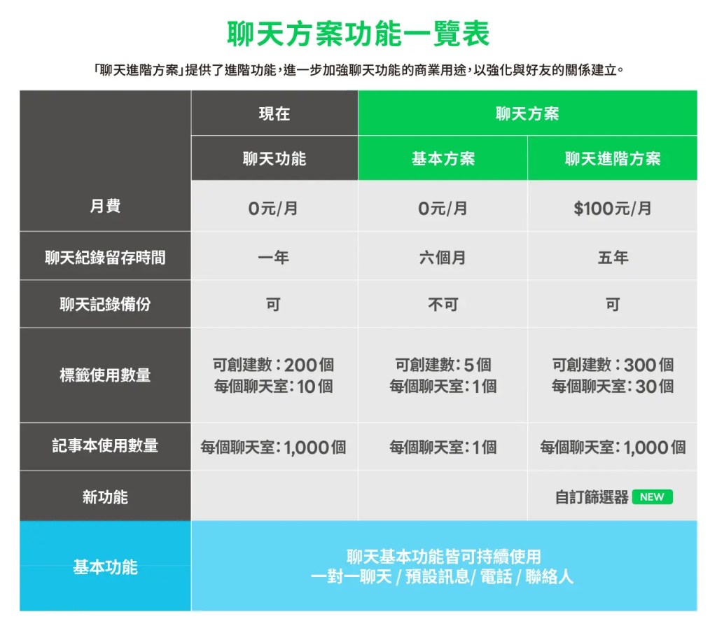 根據LINE官方給出的差異(如下圖),可以看到進階方案是以月費100元的方式進行升級,並將原先聊天紀錄留存時間、聊天紀錄備份、標籤使用數量、記事本使用數量等,都進行了異動,若未來只想繼續使用免費版的用戶,就會面臨聊天標籤使用數量只可創建最多5個,且每個聊天室只能標記1個標籤的冏境,對於需要做到分眾管理的用戶來說,可以說是影響非常巨大的改動,尤其是經營零售、電商等,有會員經營需求的賣家來說,真的是晴天霹靂。