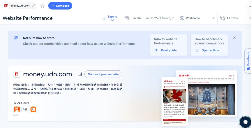 Similarweb是一個可以監測站外流量的工具,只要使用免費版本就可以看到某網站的月造訪量(Total visits)、平均瀏覽頁數(Pages / Visit)、跳出率(Bounce Rate)、造訪平均持續時間(Visit Duration),以及前5大熱門類別等資訊,透過此工具可以判斷該媒體的流量是否為佳,建議至少使用一個媒體或網站作為比較基礎。更進一步地介紹歡迎觀看此影片:【實用】免費觀看網站流量排名!similarweb簡單介紹│SEO優化好用工具。